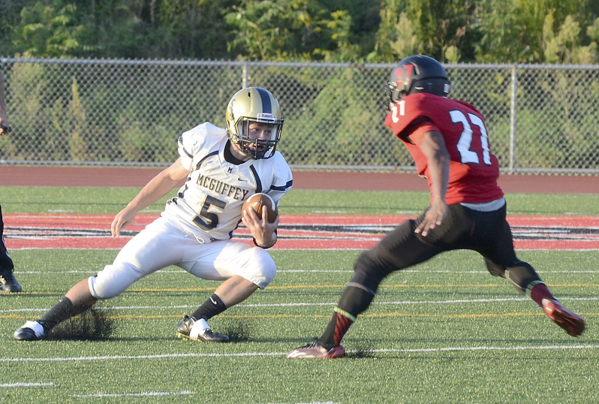 McGuffey’s James Duchi (23) breaks through and races down the sideline for a touchdown with Charleroi’s Rashaad Hairston (7) behind late in the 2nd quarter at Charleroi High School field Friday night.