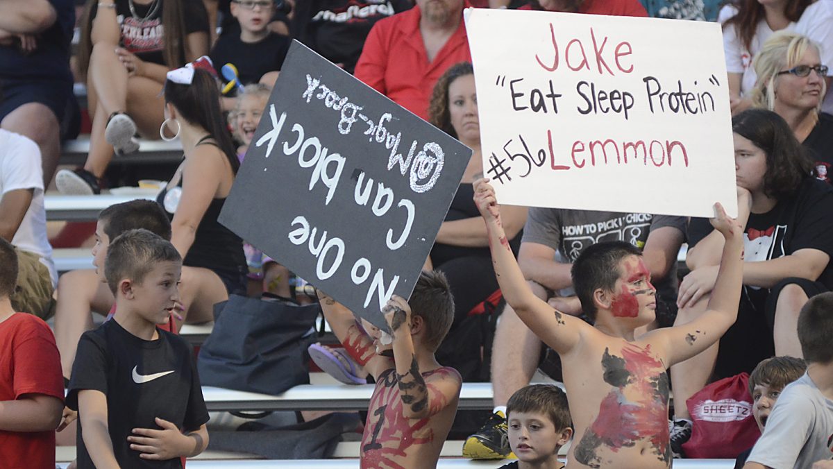 During the game against McGuffey A youngster in the cheering section for Charleroi didn’t realize his sign was upside down untill a few people shouted at him during the game at Charleroi High School field Friday night.