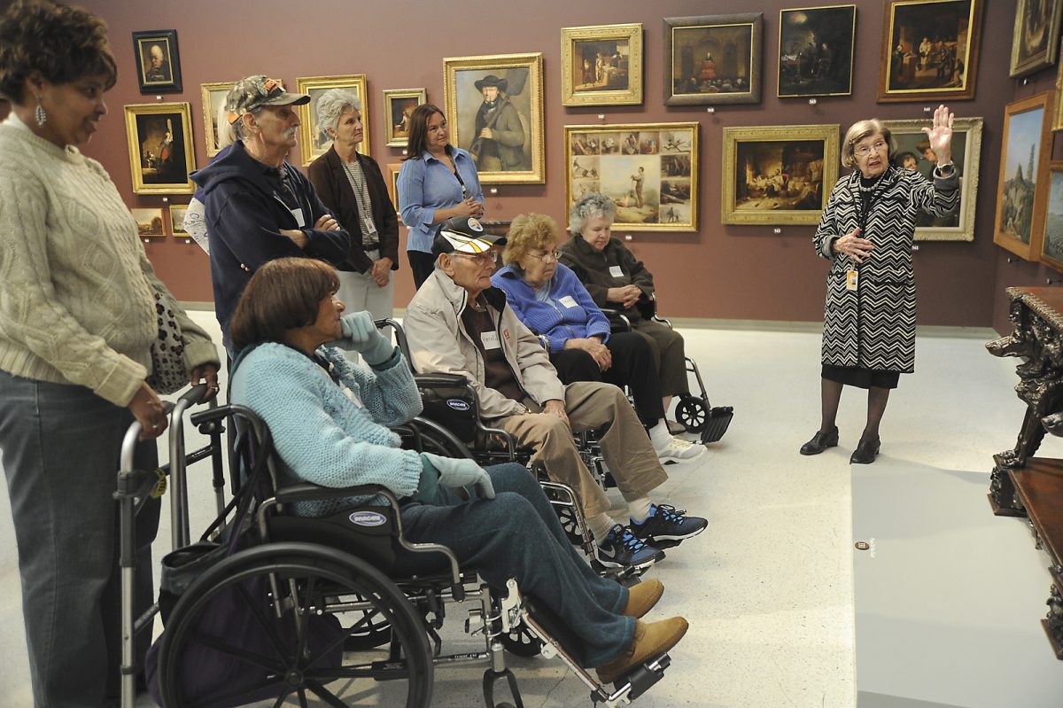 Caregivers and residents of Presbyterian SeniorCare’s Woodside Place in Oakmont listen as museum volunteer Martha Malinzak discusses a piece of art at the Carnegie Museum of Art.