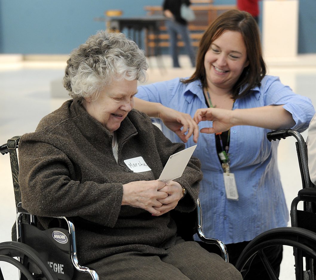 Rena Tatka, director of activities and Alzheimer’s program specialist at Southmont of Presbyterian SeniorCare in Washington, works with Francis Mele on an art project.