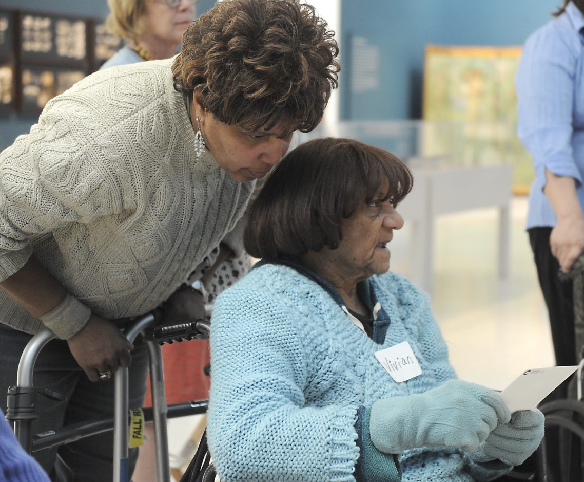 Shelby Moore looks at a print with her mother, Vivian Moore, during a tour Thursday at the Carnegie Museum of Art. The residents of Presbyterian SeniorCare’s Woodside Place in Oakmont answered questions about several pieces of artwork.