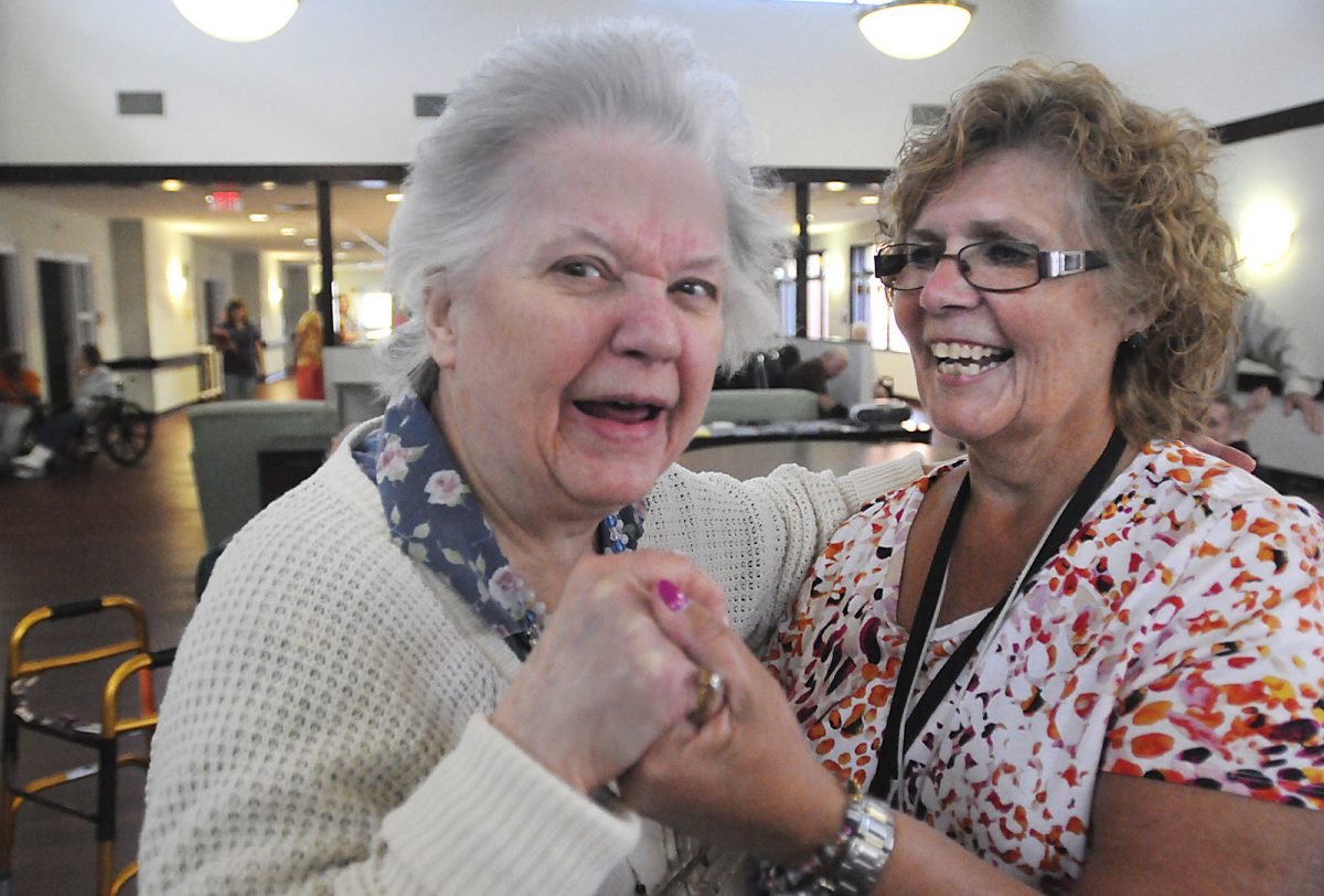 Catherine Oberman, left, dances with Marsha Dykins, an activity aide at the Washington County Health Center.