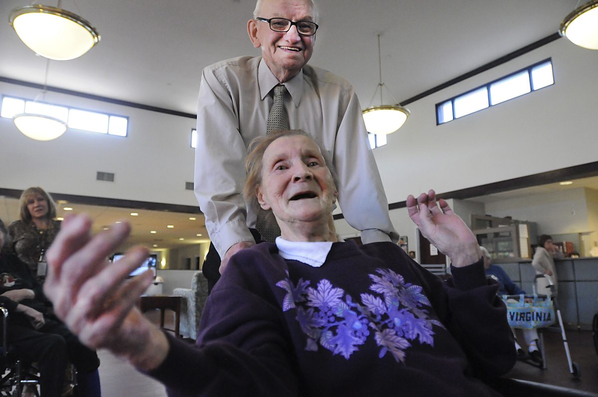 Marie Eckels loves to sing and dance to the music from her wheelchair as Dan Urbanik guides her at the Washington County Health Center.