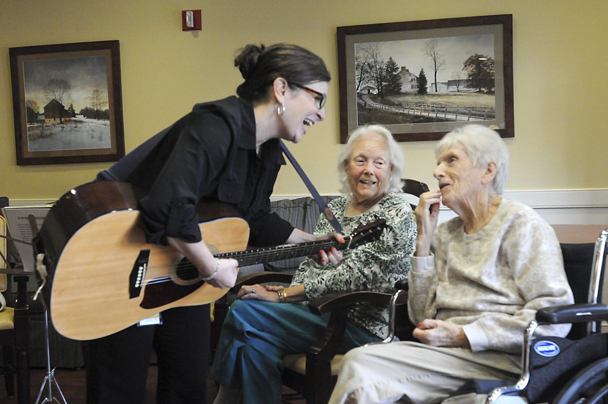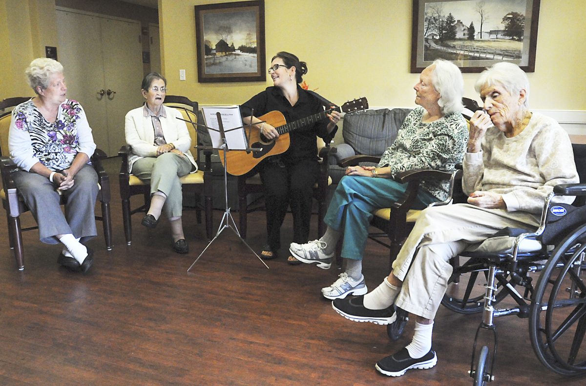 Gina Iuliucci, center, activities coordinator, plays the guitar and sings along with Woodside residents, from left, Beverly Miller, Helen Bonar, Colleen Sheldon and Anna Cowan.