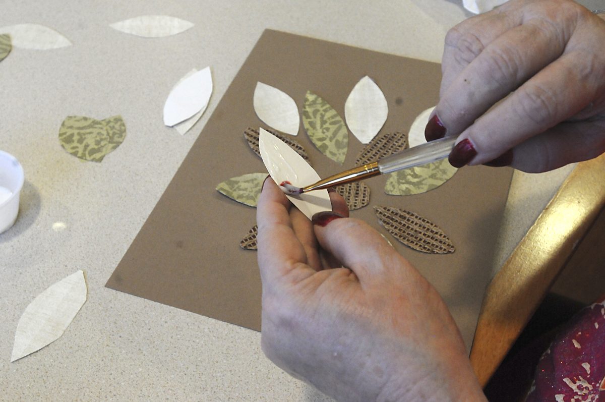 Glue is applied to paper leaves as part of an art project at Southmont of Presbyterian SeniorCare in Washington.