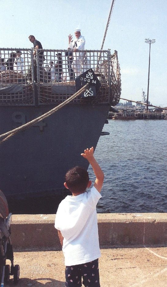 Ahoy, matey! Damaris Mayernik of Chesapeake, Va., took this photo of her son, Logan, waving to his dad, Noah, who is aboard the USS Nitze, which had just returned to Norfolk, Va., after an eight-month deployment. Noah is a son of Linus and Joyce Mayernik of Washington.