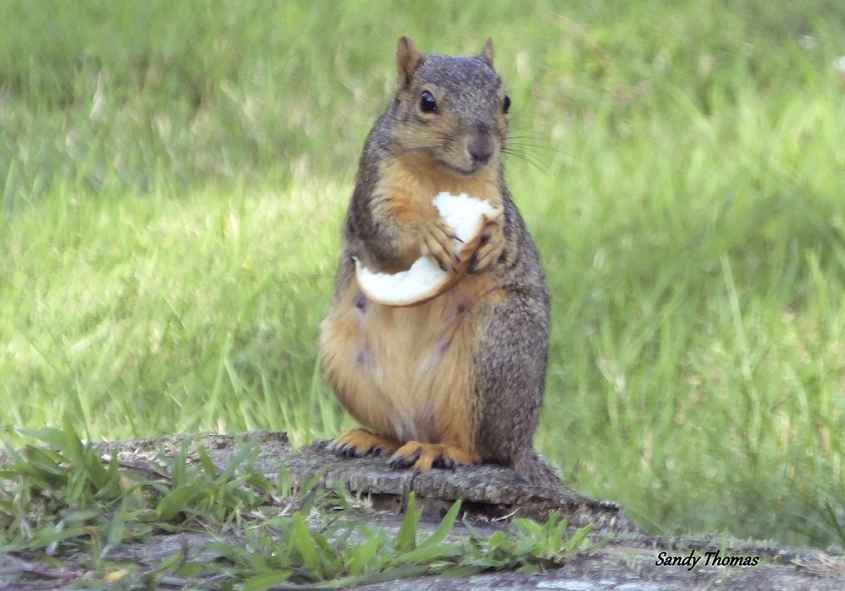 Sandy Thomas took this photo of a squirrel holding a piece of bread while she was feeding the animals in Washington Cemetery.