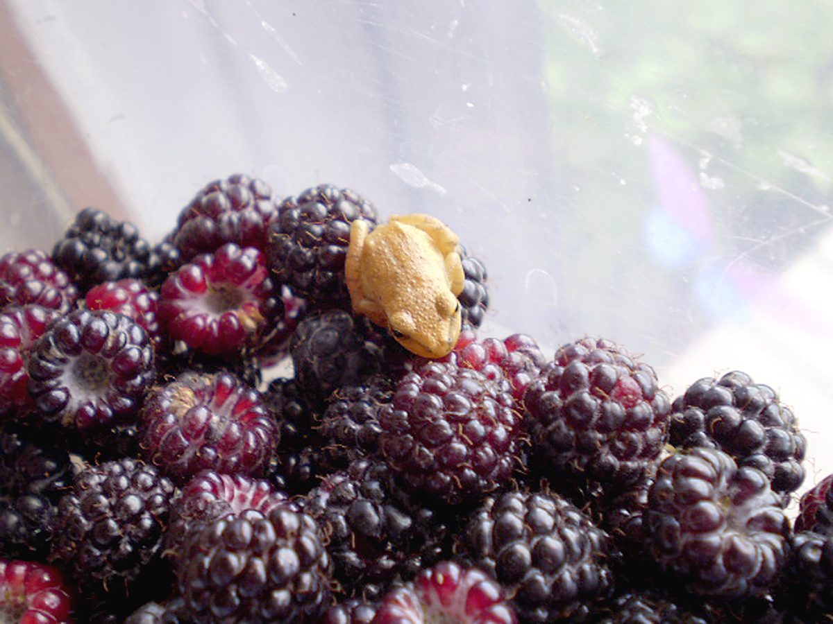 Janet Philp spotted this tiny frog after picking berries in her backyard in Eighty Four.