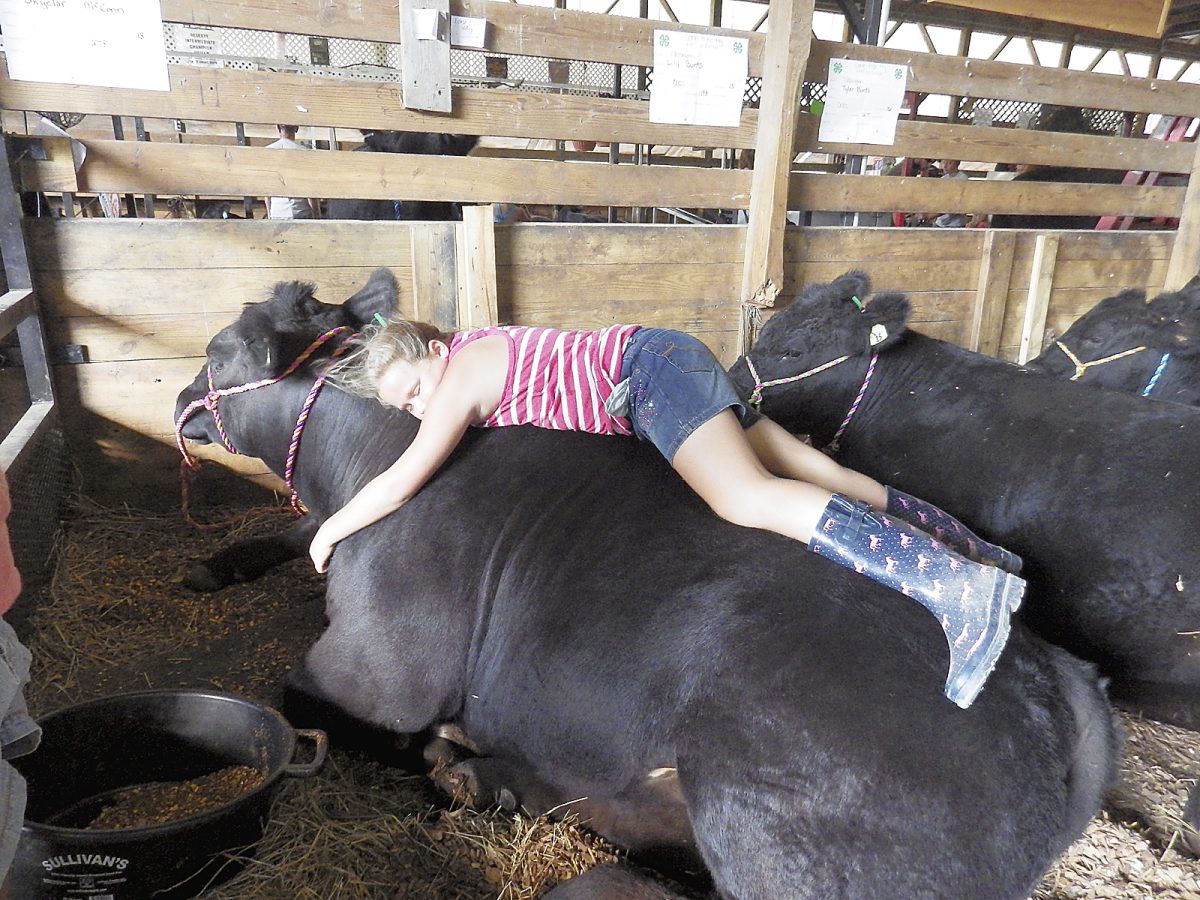 When trying to catch some shut-eye at the Washington County Fair, one sometimes has to be very resourceful. Sheila McConn sent us this photo of her granddaughter, 9-year-old Skyelar McConn, taking a rest atop her 4-H market steer, Tylor.