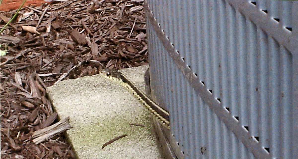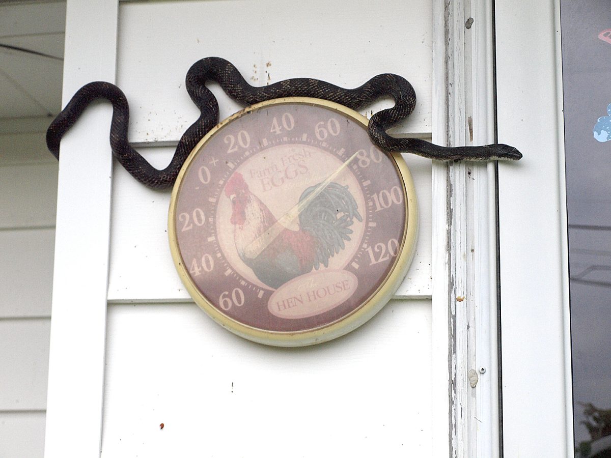 It seems that even cold-blooded snakes like to check on the temperature before they head out for the day. Janet Philp was surprised to see this big fellow who had climbed up about five feet on the side of her house, near the front door.