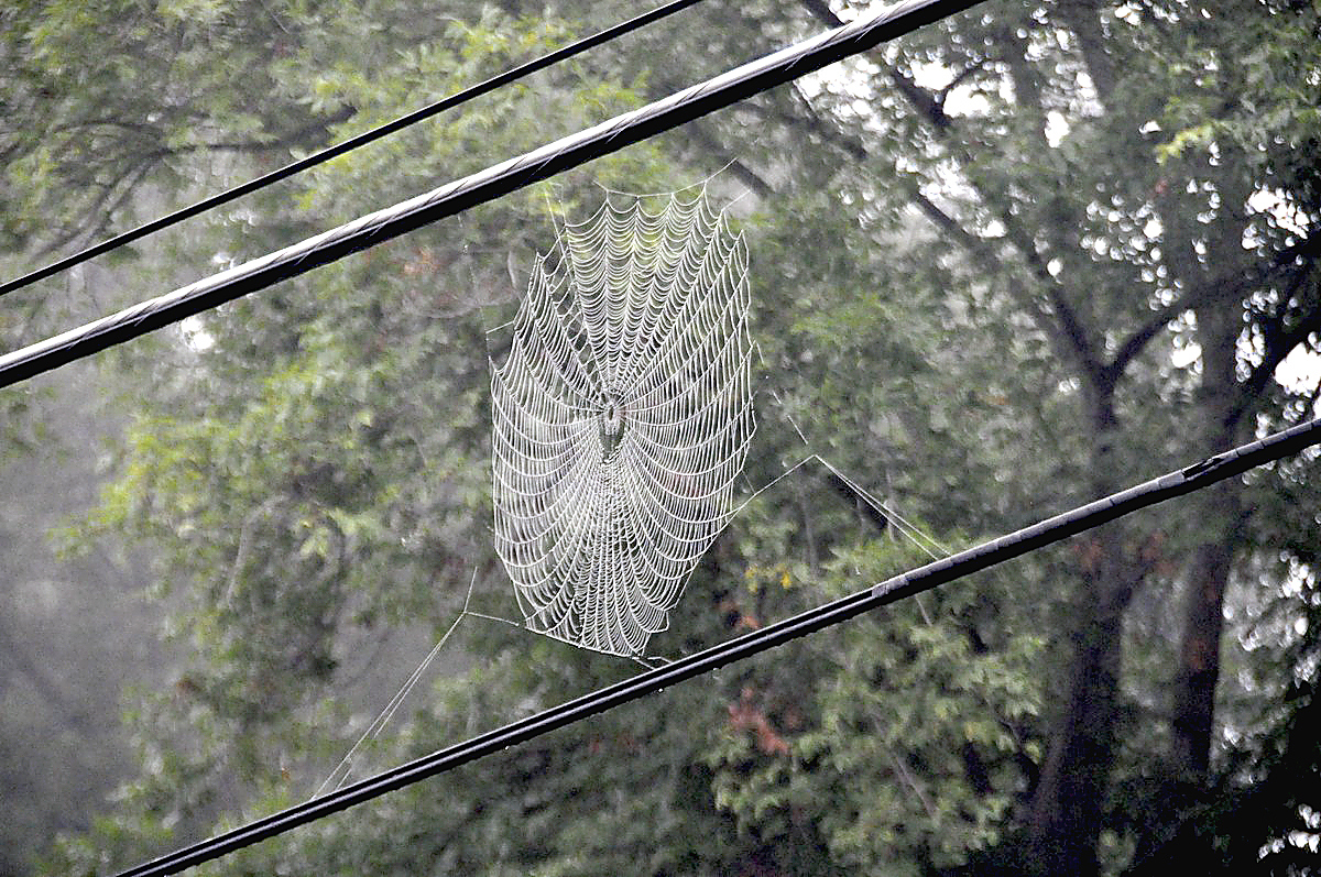 Ken Piatt says fog and the resulting dew made this spider's web stand out in its lofty location, in the overhead utility lines above McElree Road in North Franklin Township.