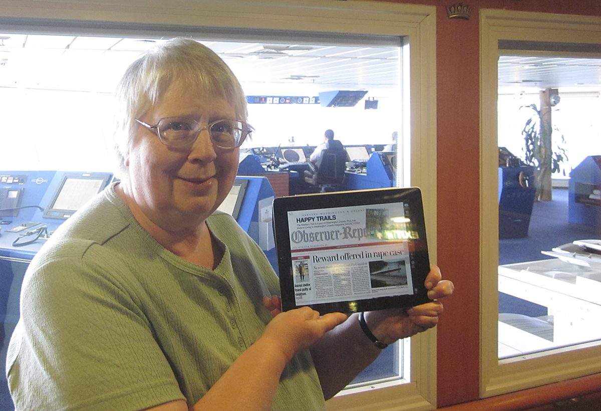 Susan Priest took the e-edition of the O-R along on the Norwegian Jade cruise ship to the Mediterranean. Behind her is the bridge of the ship.