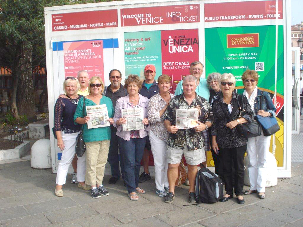 A group from Waynesburg took a 14-day Mediterranean cruise recently. They are pictured with the O-R at their last stop: Venice, Italy. Front row from left, Judy Chappel, Lisa Fontana, Sue Dugan, Jan and Gary Klinefelter and Rosetta Spade. Back row, Don Chappel, Jerry Fontana, Bob Dugan, Greg and Mary Lou Niverth and Patty Barshick.