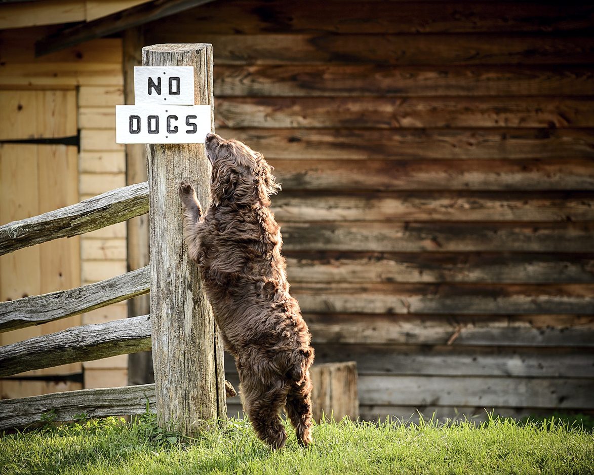 Say what? Kola, a Boykin spaniel owned by Todd and Kim Jones of Bentleyville, gets a close look at this sign banning her and other dogs from the Oliver Miller Homestead in South Park.