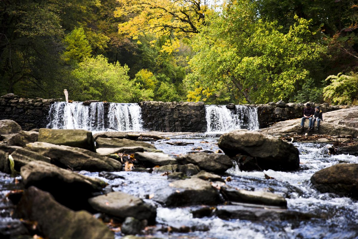 A couple, right, sits by a dam beneath the autumn foliage, Friday, Oct. 16, 2015, at the Wissahickon Valley Park in Philadelphia. (AP Photo/Matt Rourke)