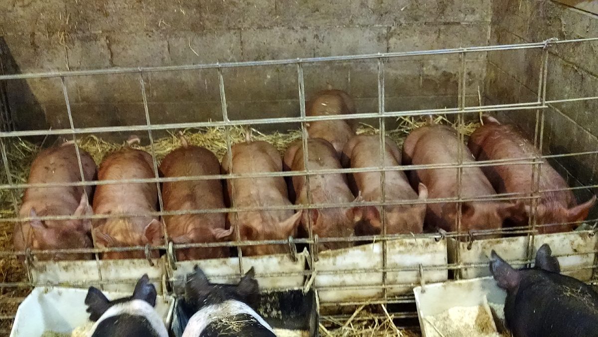 Myrta Litman of Huntington Farm in Canton Township says these Tamworth pigs lined up at a feeder reminded her of sausage links in a package. In due time.