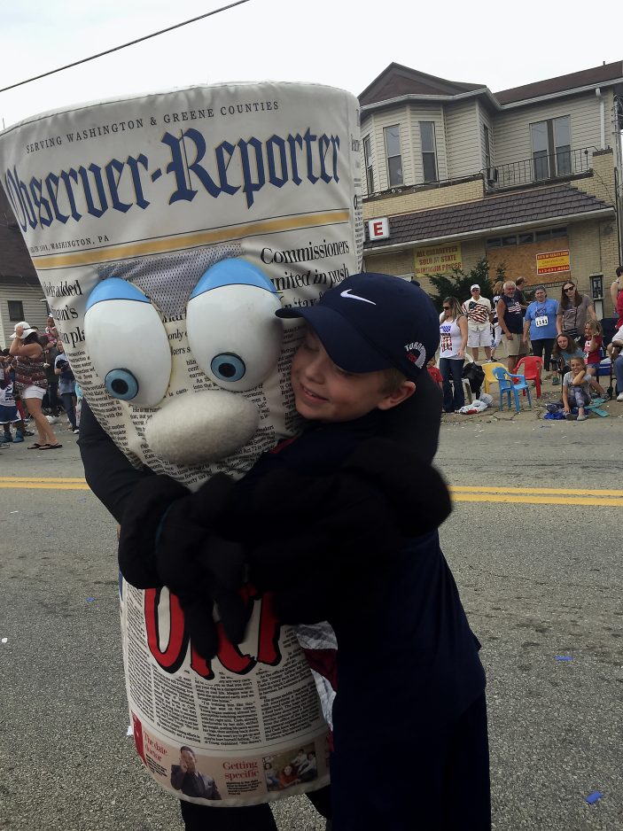 This newspaper's mascot, ORPP, got a good squeeze at the Canonsburg July 4th parade from 7-year-old Daniel Greely of Houston. Daniel's mother, Joy, captured the moment.