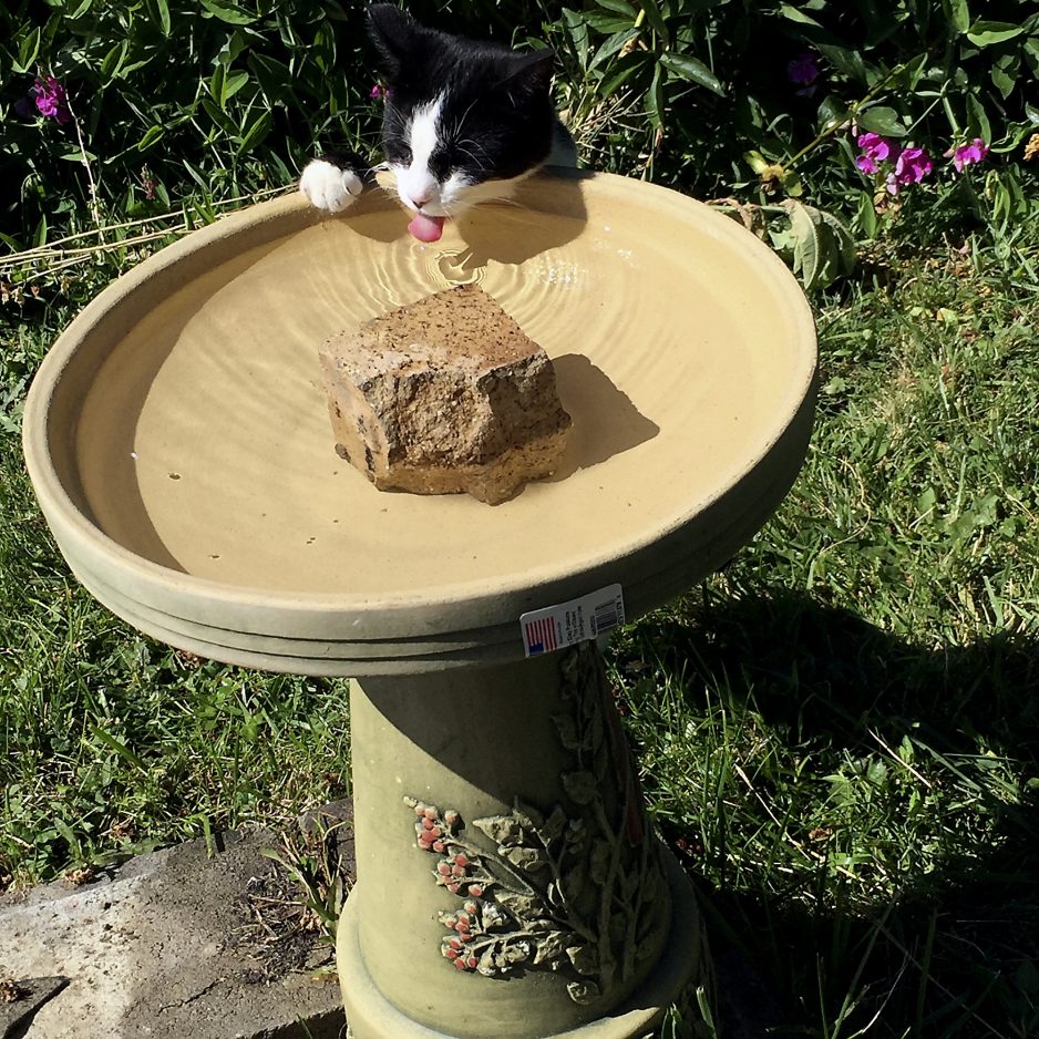 That's not going to do much for business at the birdbath. Joy Gervas sent us this photo of her cat, Luna, getting a drink after Joy had cleaned and refilled the bath.