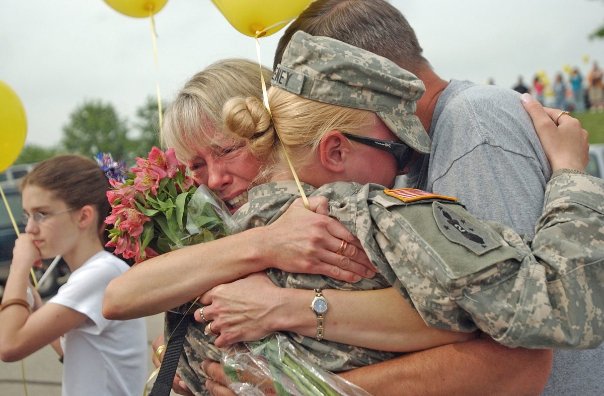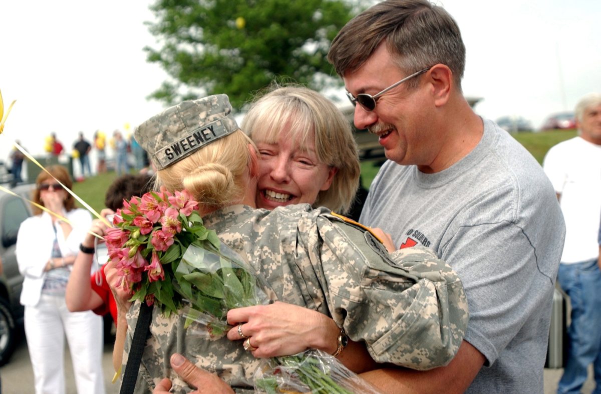 Hillary Sweeney of Holbrook gets a big hug from her parents, Louise and John Sweeney. Sweeney is a specialist with the 2nd Bridge Combat Team of the Pennsylvania National Guard.