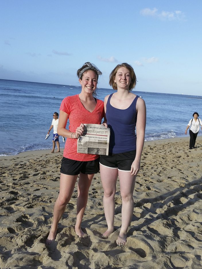 Alyssa Zrimsek and Meghan Sames took the O-R along to Hawaii. They are pictured on Waikiki Beach.