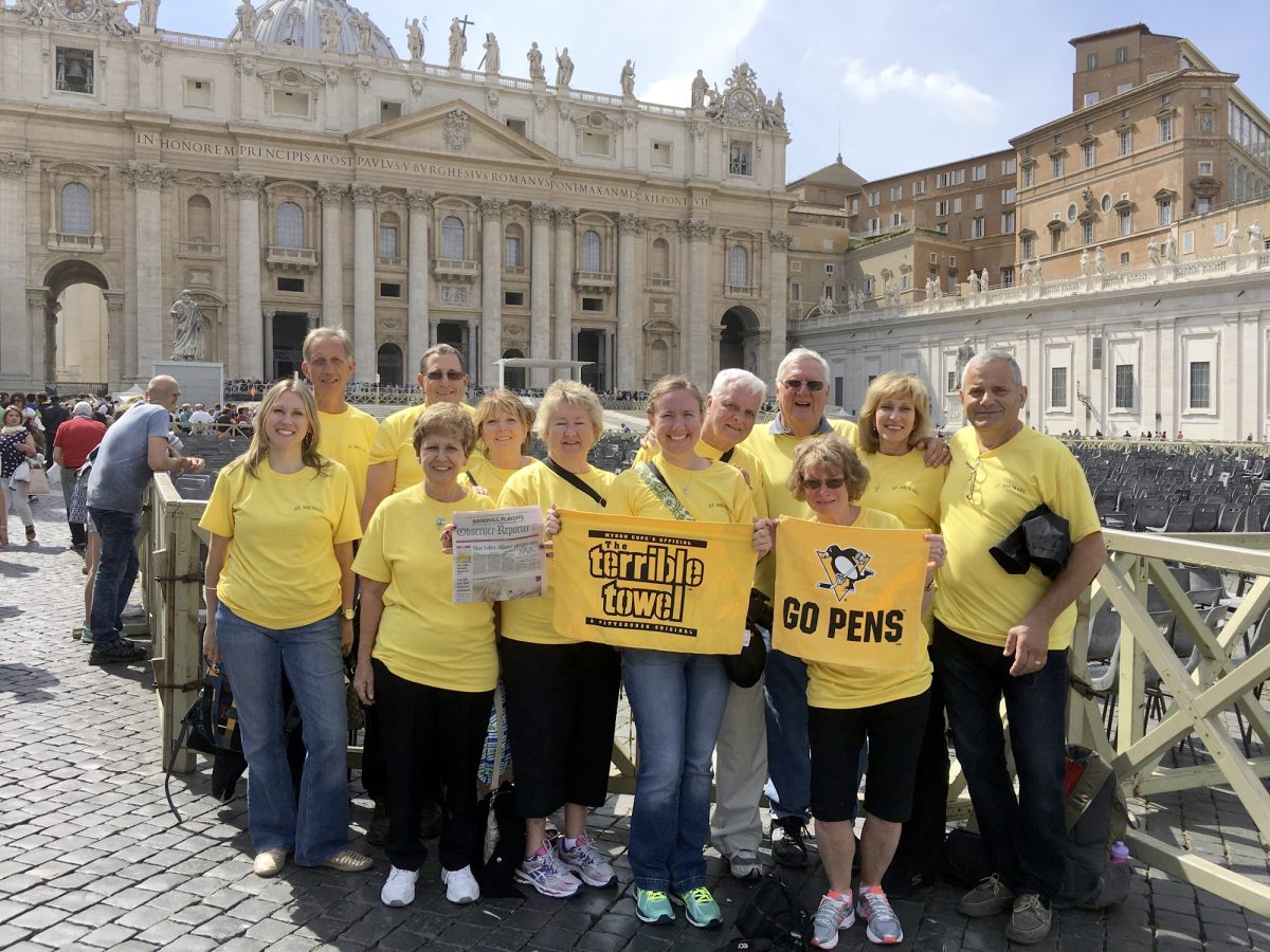 Members of St. Michael's Church of Avella took their Pittsburgh pride and the O-R all the way to the Vatican City, Italy. First row, from left, are Lisa Crosier, Sandy Chappo, Patty Terhorst, Joanne and Allyson Yukevich and Karen Birdsall; second row, Bill Crosier, Bob Chappo, Father Robert Staszewski, Tom Birdsall, Debbie and Drew Bentz.