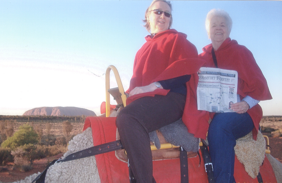 Mary Anne Smith of Eighty Four, right, and her cousin Sandra Billman took the O-R along on a camel ride to see the sunrise at Uluru, Australia.