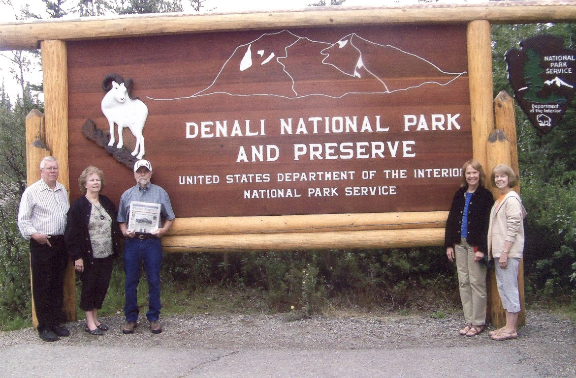 The Mounts siblings, Gary, Nancy, Jim, Donna and Diana, recently took a two-week cruise tour through Alaska and posed with the O-R at the entrance sign to Denali National Park.