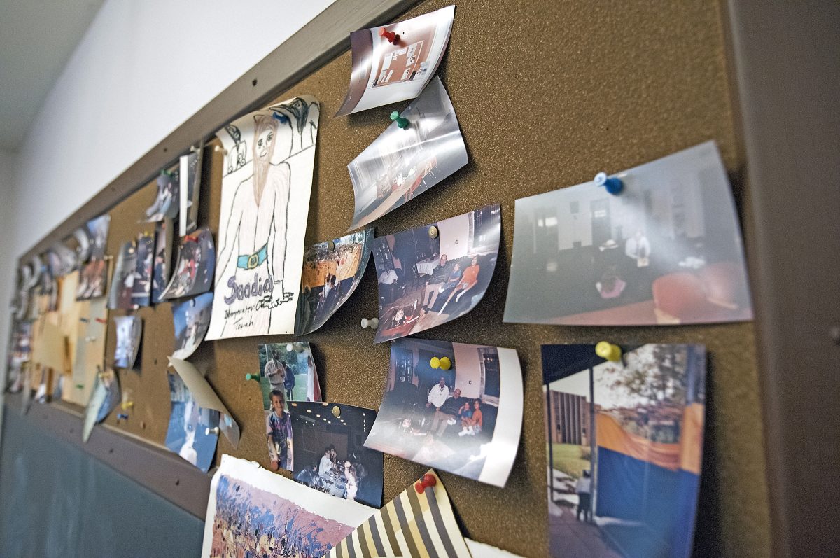 Photos on a bulletin board in one of the classrooms are a reminder of when the school was filled with children.