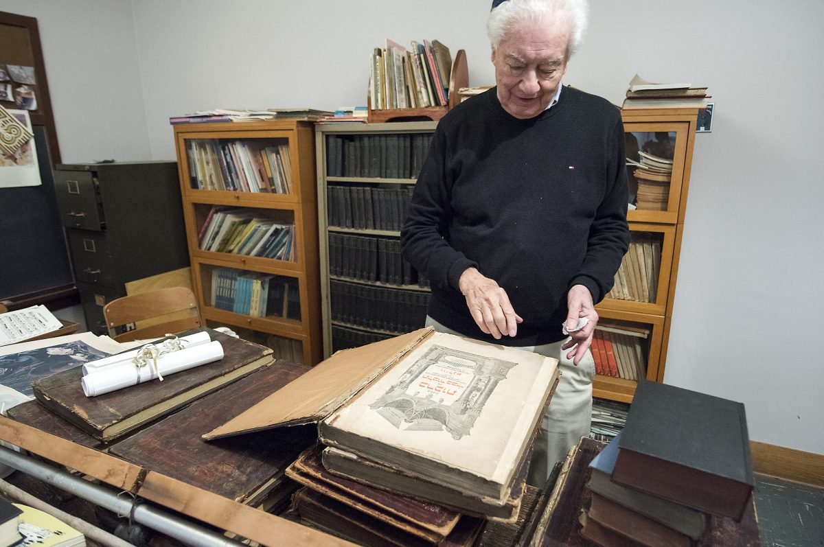 Jack Bergstein looks at a book in one of the temple’s four classrooms, which are no longer in use. The publishing date is 1880.