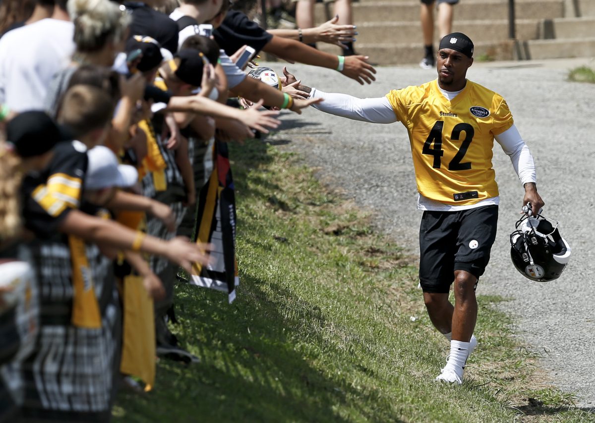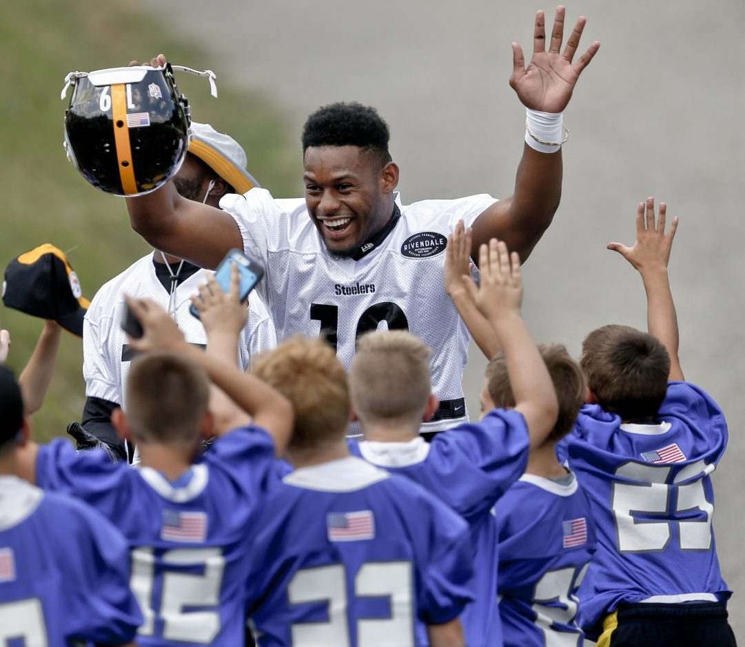 Wide receiver JuJu Smith-Schuster is greeted by young fans as he takes to the practice field in Latrobe. Smith-Schuster has agreed to a contract with the Kansas City Chiefs.