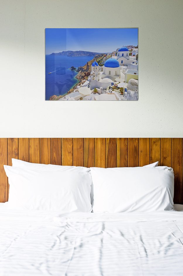 I discovered a new way to turn digital images into physical prints. The prints are printed on glass. Send your photo(s) to Fracture, www.fractureme.com. Images are expanded and sized to your specifications and then printed directly onto a piece of glass in full color. A 3/16 inch backing provides the mounting platform with a slot provided to slip over a screw. A high-resolution photo is required so that the picture doesn’t get blurry when enlarged. You can upload from your computer or import images from Instagram and Facebook. When you are designing your display, vary the size of the pictures as shown here, where a lineup of blooms cheers up the room. Or remember a sun-kissed holiday with a single image blown up to transport you at bedtime.