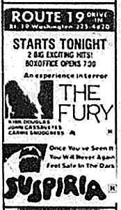 For example, 40 years ago in 1978, there was a double feature that shouldn’t have been missed at the Route 19 Drive-in. Kicking off the night would have been Brian De Palma’s horror thriller “The Fury.” Starring Kirk Douglas, John Cassavetes and Carrie Snodgrass, “The Fury” follows a former CIA agent who teams up with a psychic to save his telekinetic son from terrorists.