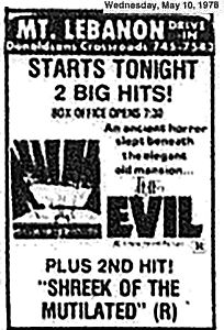 A less-prestigious horror double feature was also playing in Mt. Lebanon this past weekend in 1978. The Roger Corman produced “The Evil” and a low-budget yeti horror movie “Shriek of the Mutilated” (misspelled “Shreek” in the ad copy) were sharing a bill that night.