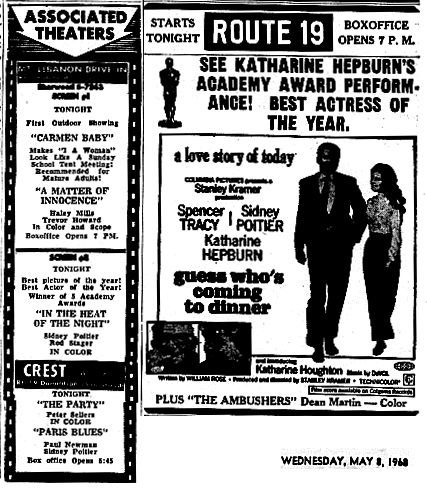 Mt. Lebanon Drive-In had that year’s Best Picture winner, “In the Heat of the Night,” playing on its own screen – apparently without a second feature. But Route 19 was featuring “Guess Who’s Coming to Dinner,” which was a controversial film for 50 years ago, as it depicting a white woman (Katherine Hepburn, who won Best Actress in a Leading Role that year) bringing home her African American fiancé to meet her parents.