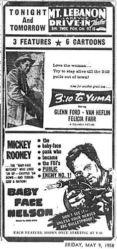 And going back 60 years to 1958 was a double feature at Mt. Lebanon featuring the classic Western “3:10 to Yuma” backed with “Baby Face Nelson,” a true-crime gangster film starring Mickey Rooney.