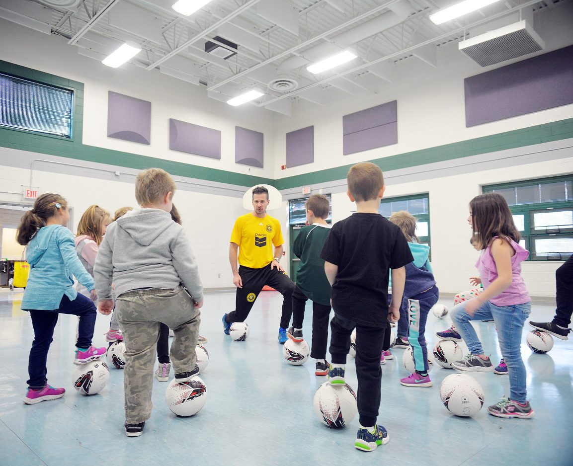Chevron’s funding provides equipment – soccer balls, bags, cones, etc. – as well as a soccer-inspired curriculum for the gym teachers to utilize in their classes when the Riverhounds end their stay at the schools.