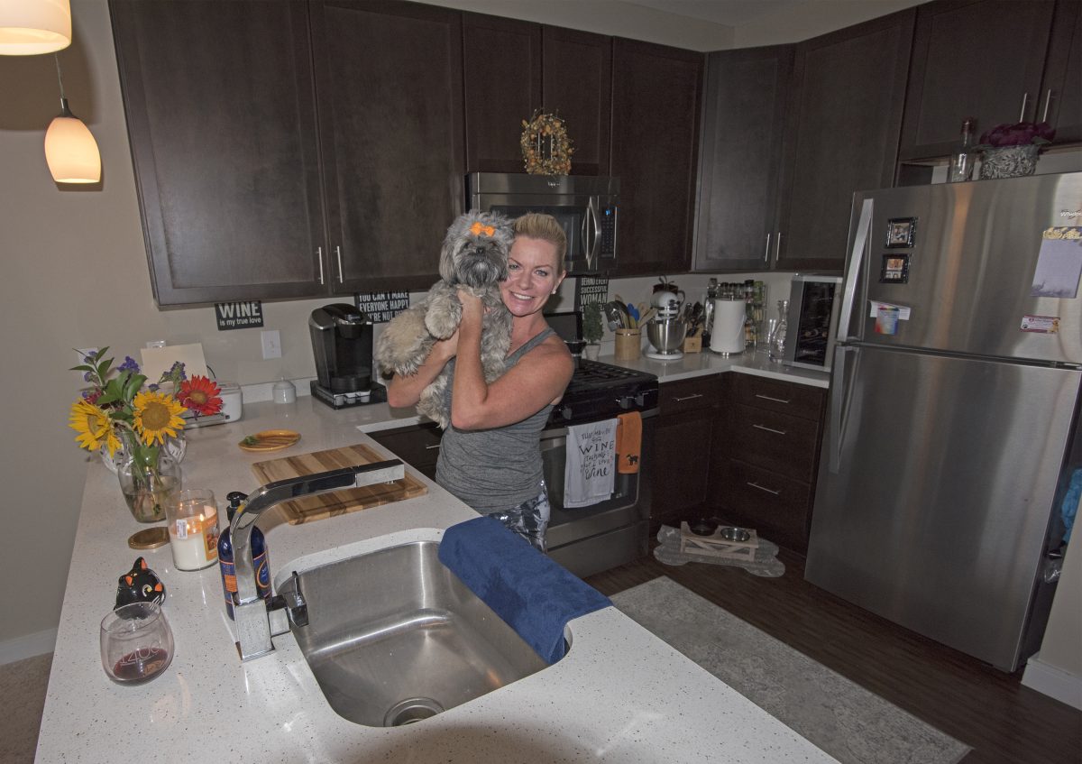 Inside the apartment she shares with Lola, King extolls the virtues of being a few hundred yards from Town Center, an eclectic mix of popular dining spots, retail, professional offices and recreation. “We frequent the restaurants,” she says, during a visit with Matt Lanctot, a friend and tenant in another unit. “You can go anywhere and know five people or more.”