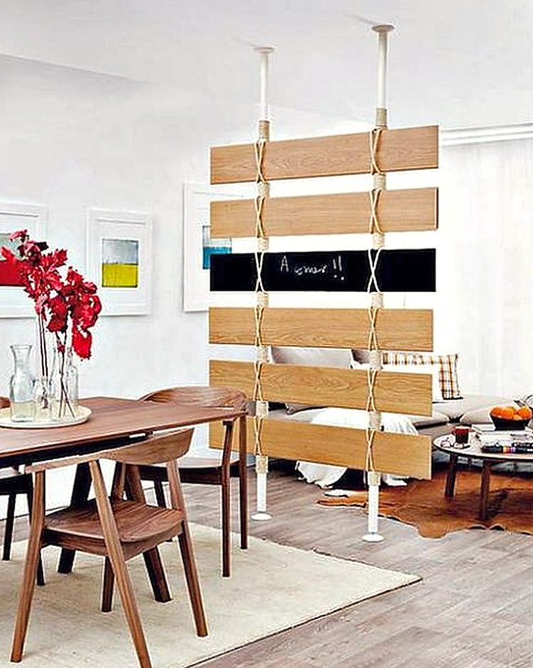 Another way to go is shown here. A DIY partition separates the sitting and eating areas. A series of wood planks are strung from two tension bars with space left in between the planks. A solid wall would make each room feel very small, but the openings allow both rooms to breathe.