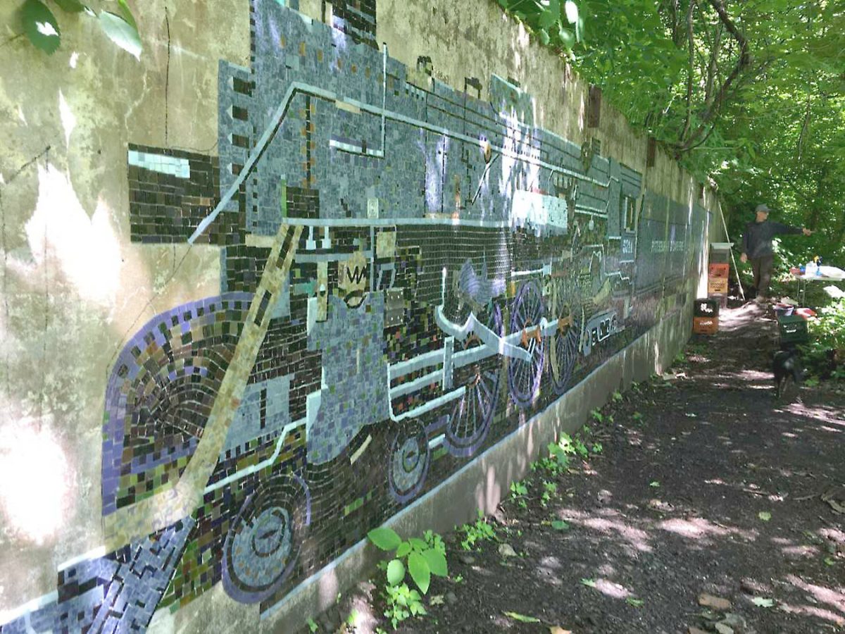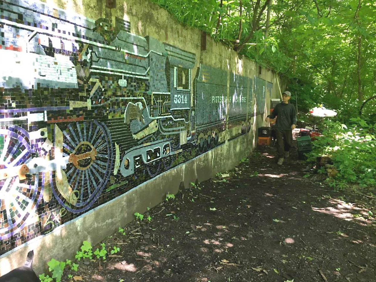 Stevo Sadvary, of Pittsburgh, whose father and grandfather were miners, has created The Ruins’ most ambitious project: a 50-foot-long representation of a Pennsylvania & Lake Erie train pulling coal cars on the side of a wall that overlooks the Great Allegheny Passage.