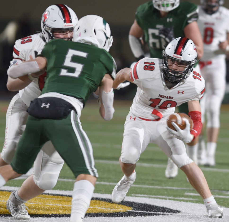 Peters Township’s Breylen Carrington (19) attempts to elude Eli Jochem (5) of Pine-Richland during WPIAL Class 5A championship action.