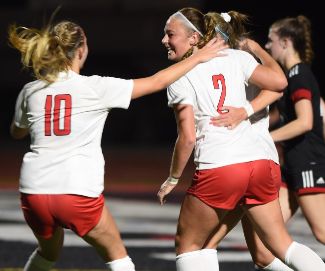 Peters Township players including Lexi Pirosko (10) congratulate Irene Doleno (2) after she scored the equalizer in a section contest against Upper St. Clair.