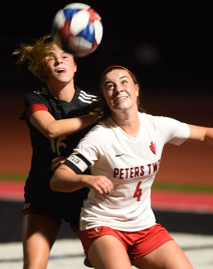 Peters Township's Jillian Marvin (4) battles Upper St. Clair's Alexandra Duda (16) for a header during section soccer action. A pair of goals by Irene Doleno and Bella Spergel enabled the Lady Indians to overcome a 1-0 deficit to take the lead, 2-1, by halftime.