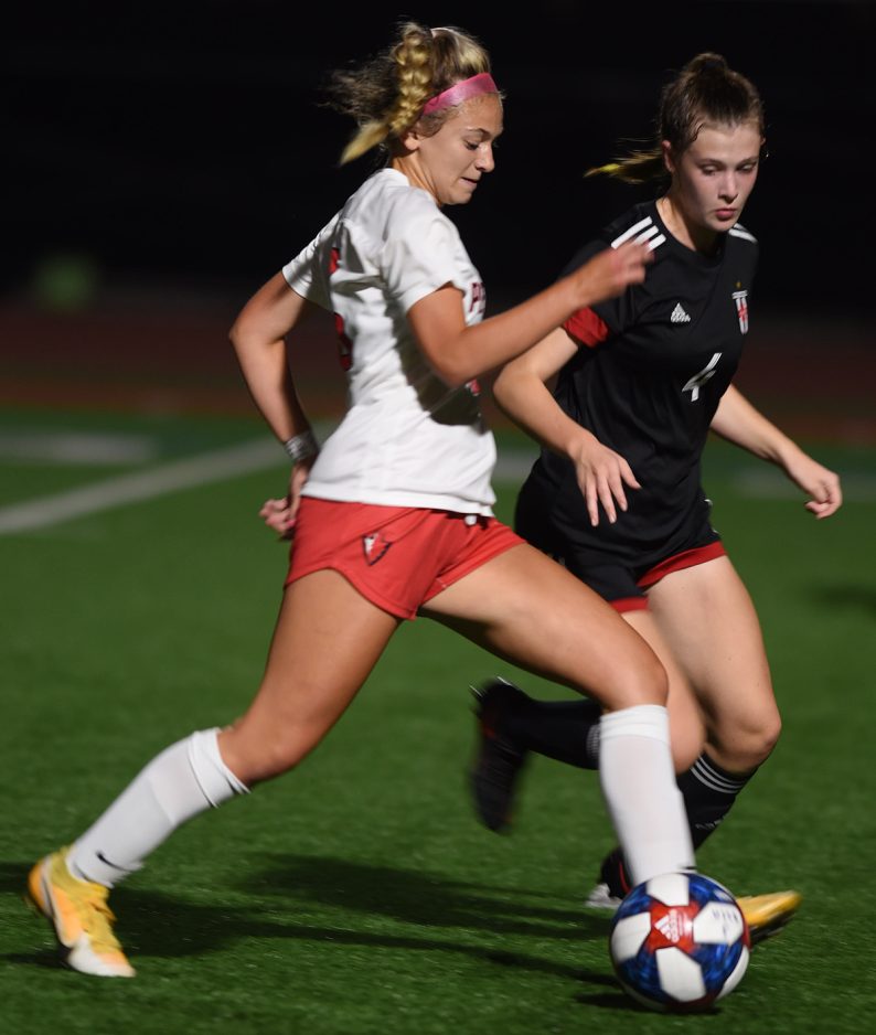 Peters Township's Sophia Trapanotto (11) dribbles the ball past Upper St. Clair's Olivia Lagoy (4) during girls soccer action.