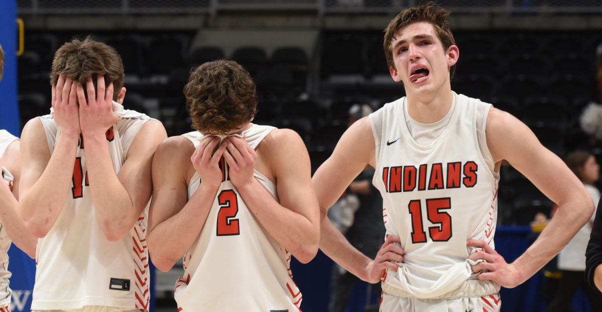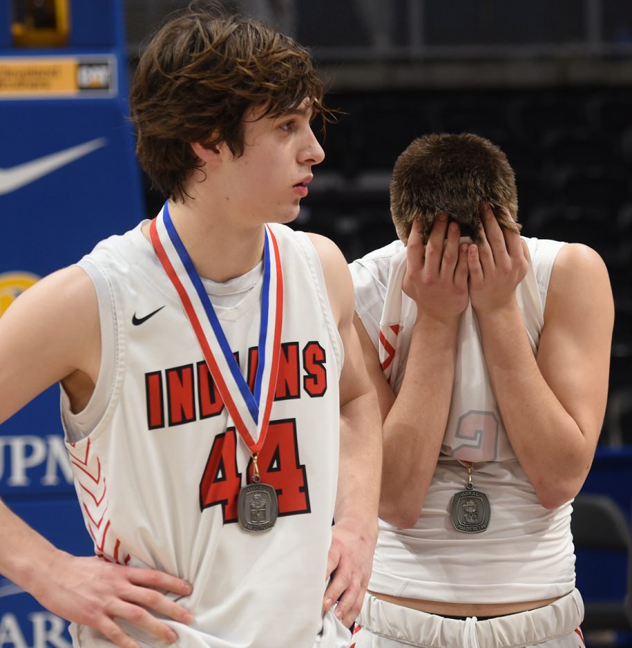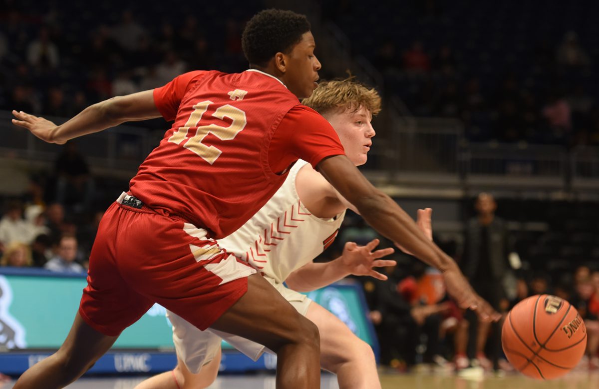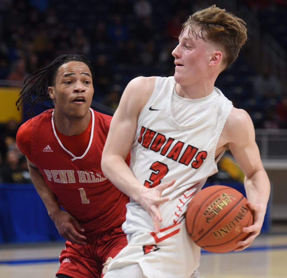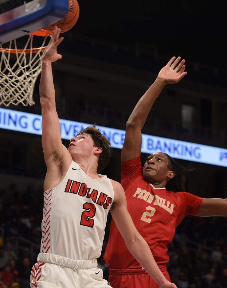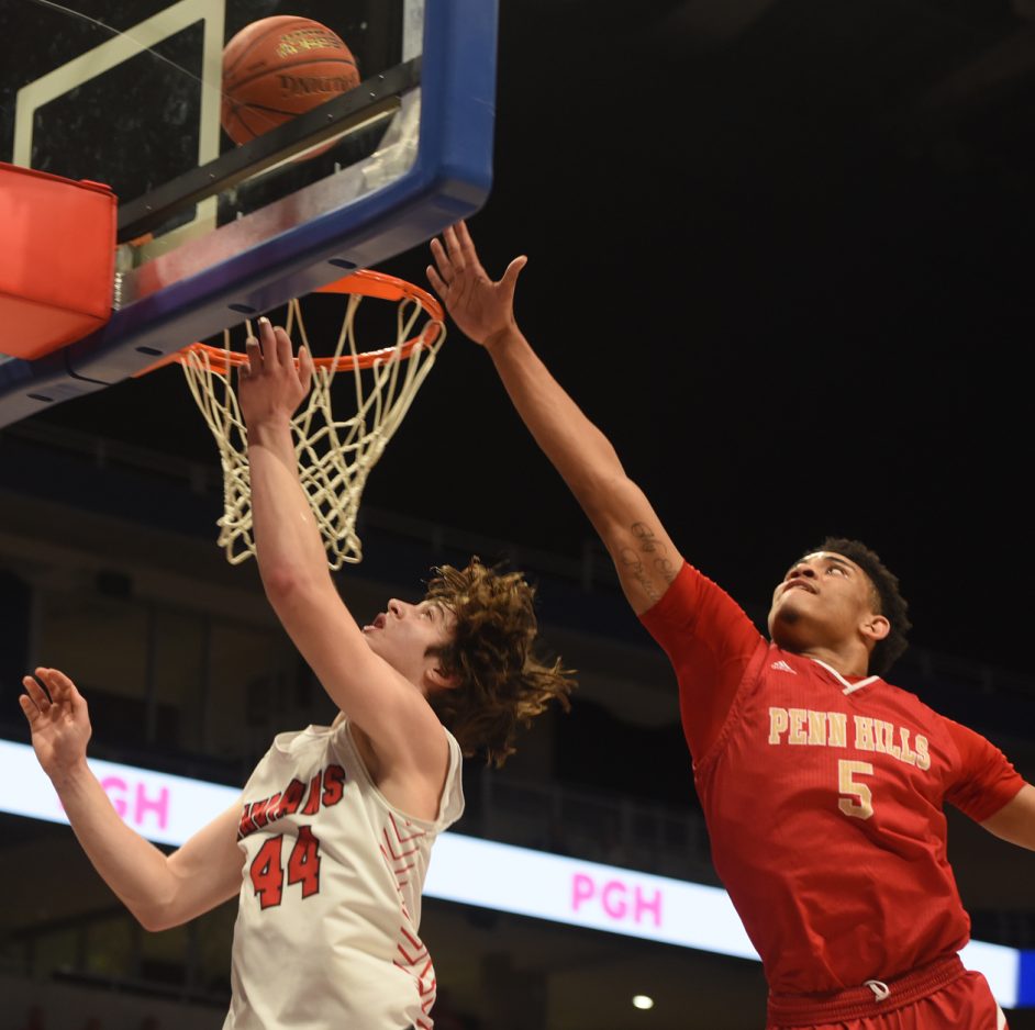Brendan McCullough has his shot contested by Julian Dugger. Dugger was called for goaltending and the basket counted for McCullough during second-quarter action in the WPIAL Class 5A boys championship game Thursday night. Penn Hills defeated Peters Twp. 70-65. The game ended too late for a story to be included in this edition. Visit www.obserever- reporter.com for game details.