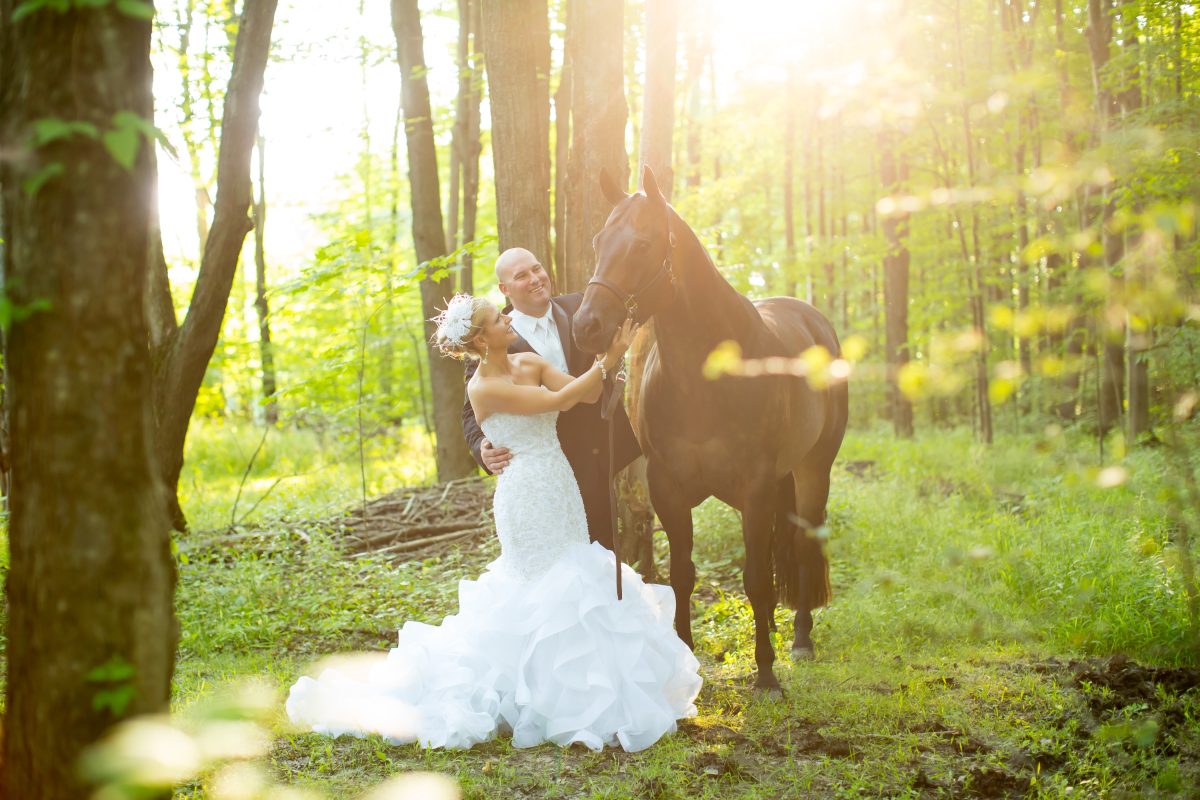 The next day, the couple donned their wedding attire once more for a photo session with Nicole’s show horse, Only Mist Once, affectionately known as Roger.