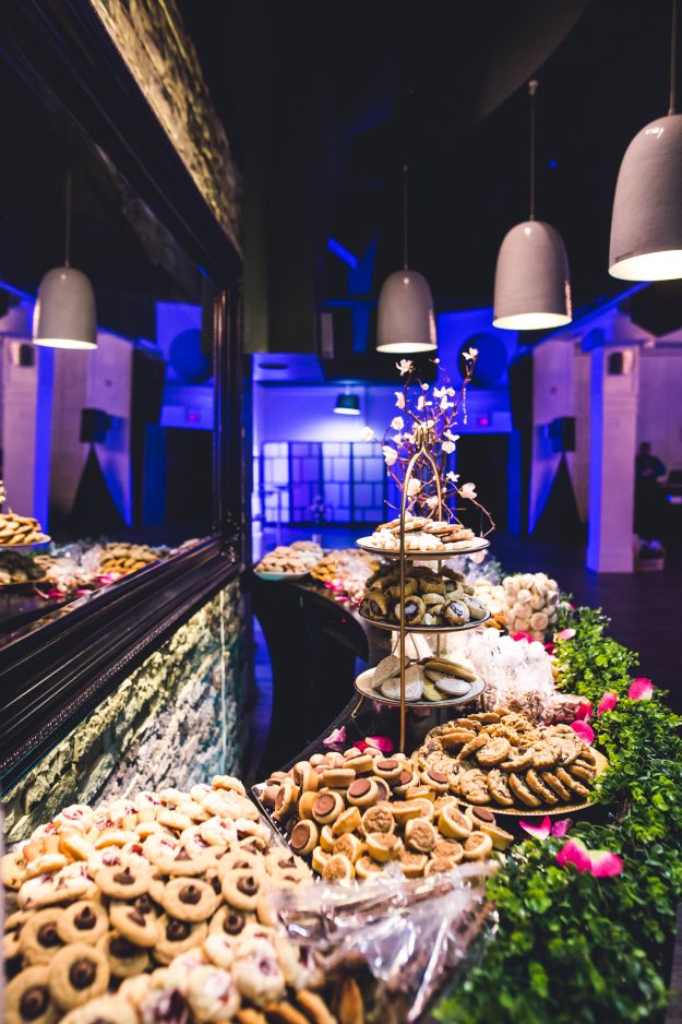 Centerpieces made with branches, blush pink roses, white pearls and gold bows filled the tables as guests noshed on bites by Sausalido, and of course hundreds of cookies, including the bride’s favorite – carrot cake cookies – baked by family and friends. The couple’s tasty almond cake by Giant Eagle featured fresh strawberries and strawberry filling. “Everyone did a really good job,” says Simchah. “Our vendors were so unbelievably helpful. It all worked out perfectly.”